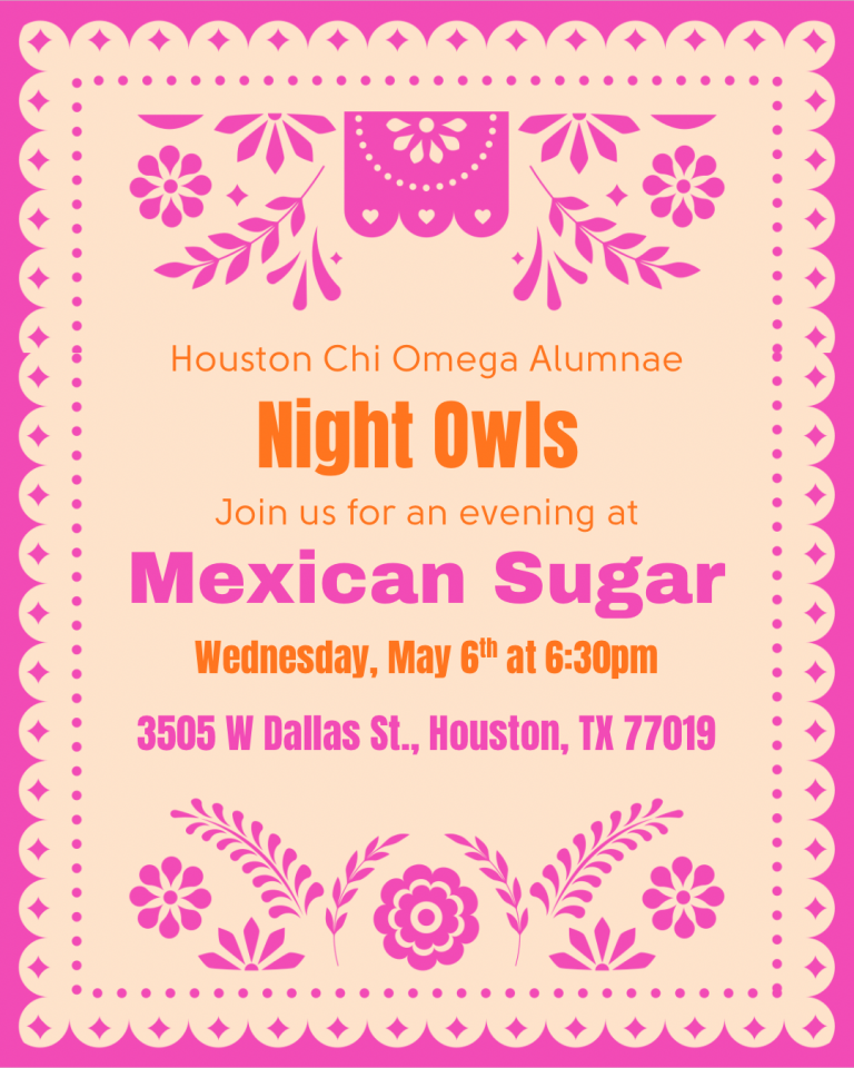 Whether you’re a familiar face or joining us for the first time, this year is all about connection, community, and Chi Omega pride. Thank you for being part of what makes our Houston alumnae chapter so special. I can’t wait to celebrate, serve, and make memories together.