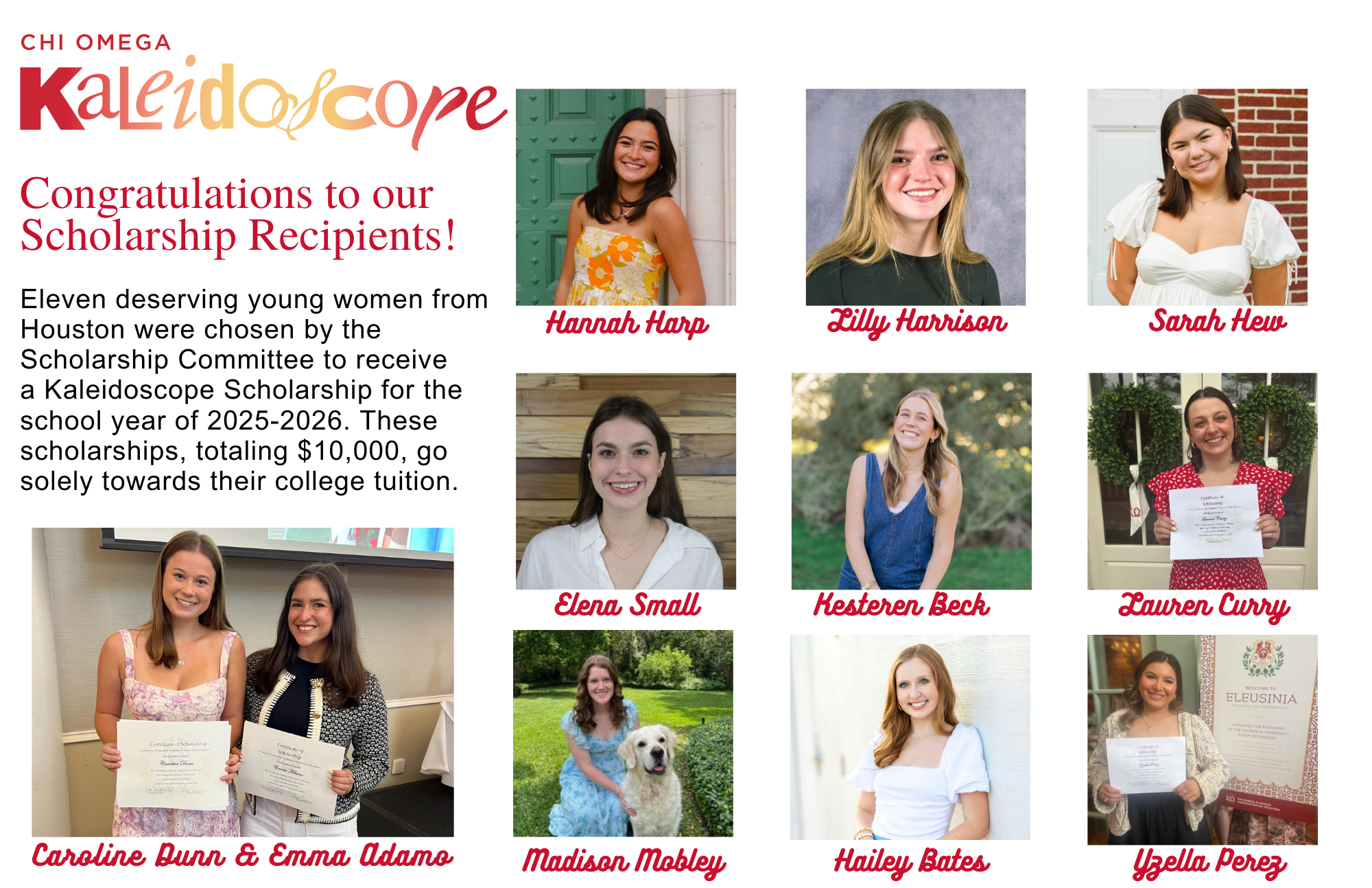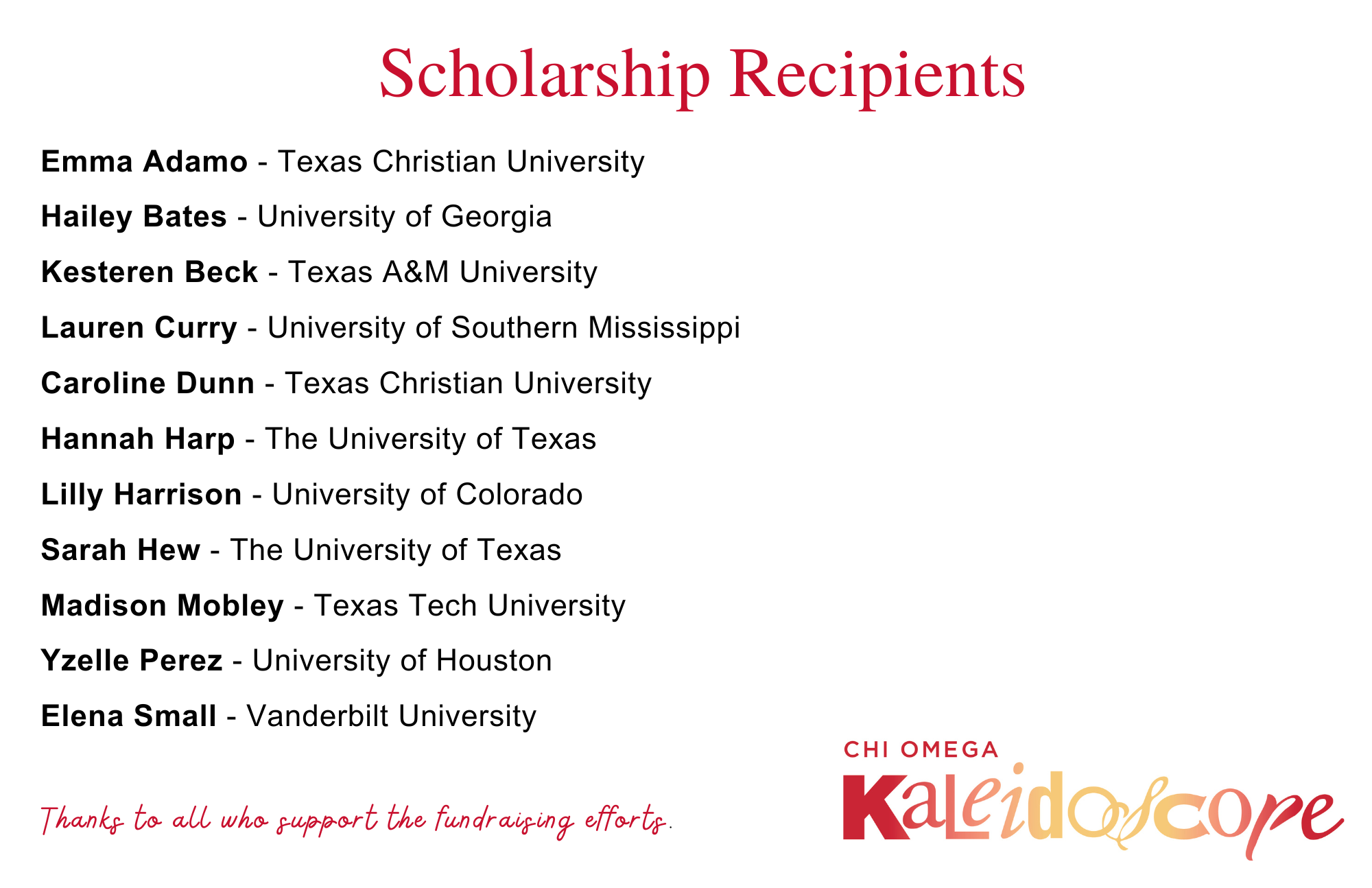 Since 2004, Chi Omega Kaleidoscope has been actively fundraising to help collegians from the Houston-area attain their educational goals. To date, 179 women have been awarded scholarships for tuition and other educational fees. Nearly $300,000 has been generously gifted by members, like you, to support these programs and the bright futures of collegiate women!  Chi Omega collegiate members, who were awarded tuition scholarships during the past five years, are listed below. Our heartfelt congratulations to each of these deserving scholars and campus leaders!